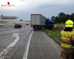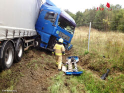 KORNEUBURG (NÖ): Am Montag, den 14. September 2015, war es gegen 13:00 Uhr am Autobahnknoten Korneuburg zu einem Lkw-Unfall gekommen. Auf dem Beschleunigungsstreifen der A22, Richtungsfahrbahn Wien, war ein Lkw-Sattelzug aus unbekannter Ursache von der Fahrbahn abgekommenen und in den Straßengraben gerutscht.