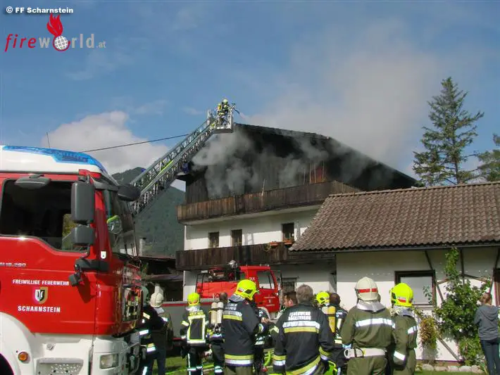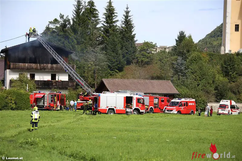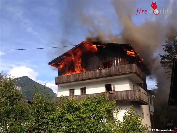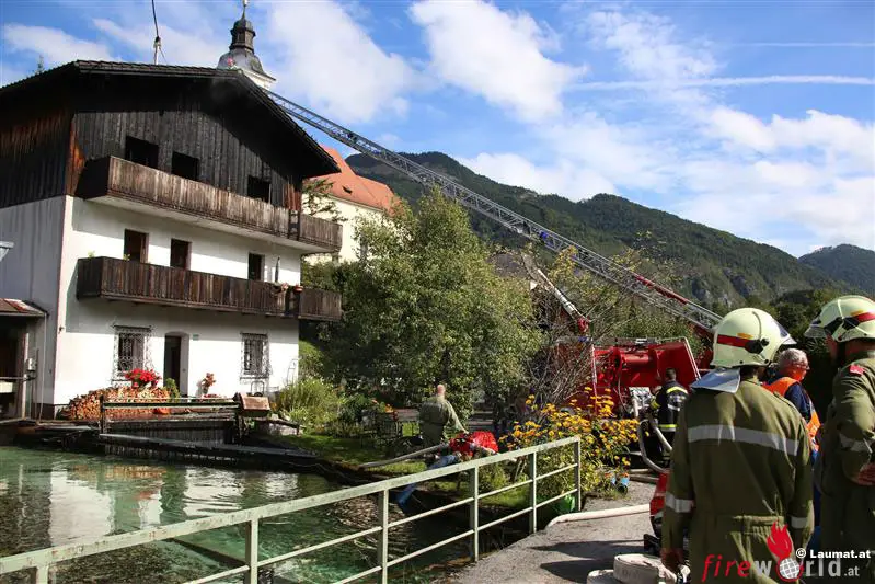 GRÜNAU IM ALTMTAL (OÖ): Am Dienstag, 15.09.2015, wurde die Feuerwehr Grünau im Almtal um 09:39 Uhr von der Landeswarnzentrale zu einem Wohnhausbrand in das Ortszentrum von Grünau im Almtal alarmiert. Kurze Zeit später wurde Alarmstufe 2 mit den vier weiteren Almtaler Feuerwehren ausgelöst. Bereits bei der Anfahrt war eine große Rauchsäule über dem Ortszentrum von Grünau sichtbar.