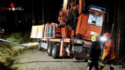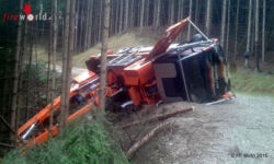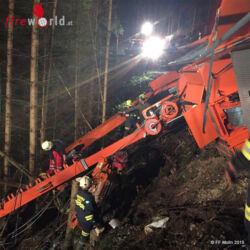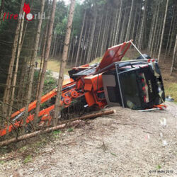 MOLLN (OÖ): Die Feuerwehren Molln, Ramsau und Micheldorf wurden am Montag, den 14. September 2015. zu einer Lkw-Bergung in den Ortsteil Ramsau gerufen. Ein Seilkran-Lkw war beim Umstellen von der Forststraße abgekommen und umgestürzt.