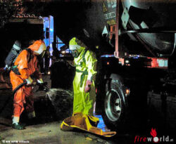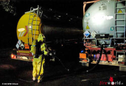 Bei einem Sattelzug tropfte aus dem Tank geringe Mengen konzentrierte Schwefelsäure. Der Fahrer hatte das durch eine Beschädigung der Luftleitung (wurde durch die ätzende Säure bereits aufgelöst) bei seinem Lkw bemerkt und die Feuerwehr alarmiert.