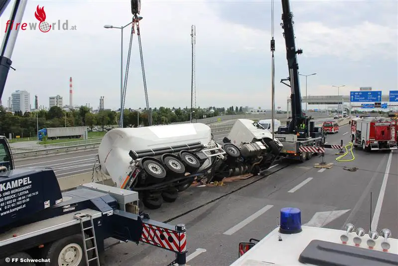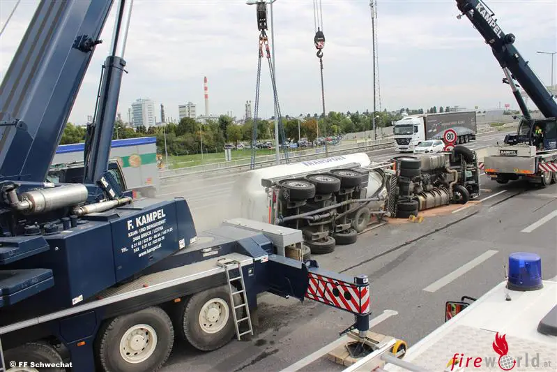 SCHWECHAT (NÖ): Kurz nach Mittag des 15. September 2015 wurden die Freiwilligen Feuerwehren Schwechat und Rannersdorf zu einer schweren Bergung alarmiert. Beim Eintreffen bot sich folgende Lage: Ein mit 28 Tonnen Asche beladener Sattelzug stürzte auf der S1 beim Knoten Schwechat um und blieb auf der Fahrerseite liegen. Der Fahrer wurde nur leicht verletzt.