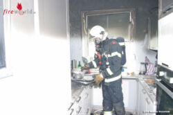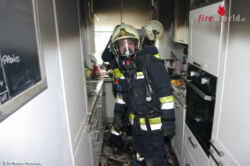 Der Trupp öffnete anschließend die Wohnungstüre von innen, um den Innenangriff zu erleichtern. Im Bereich der Küche kam es, vom Herd ausgehend, zu einem Brand. Beim Beginn der Löscharbeiten standen bereits Teile der Kücheneinrichtung in Brand. Das Feuer konnte jedoch rasch mit einer Löschleitung unter Kontrolle gebracht werden.