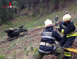 Oö: Spektakuläre Traktorbergung mit mehreren Feuerwehren im Steilgelände in Gaflenz