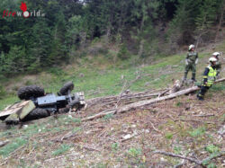 Dabei wurde ein Traktor vorgefunden, der in sehr steilem Gelände seitlich lag. Die nächste befestigte Straße befindet sich etwa 200 Meter entfernt oberhalb der Unglücksstelle, wobei ein massiver Höhenunterschied zu überwinden ist. Von der Unterseite führt nur ein sehr schmaler Forstweg zur Unfallstelle, der jedoch mit Feuerwehrfahrzeugen nicht, und selbst mit Traktoren nur sehr bedingt befahrbar ist und somit als brauchbare Variante ausschied.