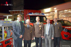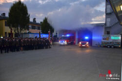 Präsentiert wurden die Fahrzeuge in Action und so manch ein Feuerwehrmitglied fragte sich bereits nach dem Einmarsch, wo denn nun die Fahrzeuge blieben. Alles wurde klar, als Feuerwehrkommandant Michael Hutterer den Befehl gab „Fahrzeuge marsch“ und hinter zwei vernebelten Glastoren die Blaulichter angingen. So präsentierte die Einsatzmannschaft die Fahrzeuge und die Container in Action und aus dem Mannschaftstransportfahrzeug stiegen auch Personen in Einsatzbekleidung aus – dies waren jedoch Sänger des Vocalensemble Innpuls – welche ein Überraschungsständchen darboten.