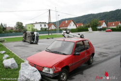 Ein Pkw prallte gegen ein Hindernis, eine Person sollte daraus gerettet werden, so stellte sich die Szene eins dar. Ein Fahrzeug am Dach hatte im Fall zwei eine Übungspuppe in sich verborgen, die unter den gegeben Umständen, mit den vorhandenen Mitteln über das Heck befreit werden wollte. Wieder mit einem lebenden Darsteller bestückt, lag ein drittes Wrack auf der Fahrerseite. Erst nachdem das Dach geöffnet war, konnte der Patient aus dem Fahrzeug befreit werden.