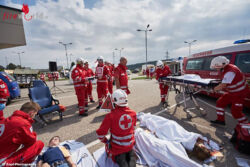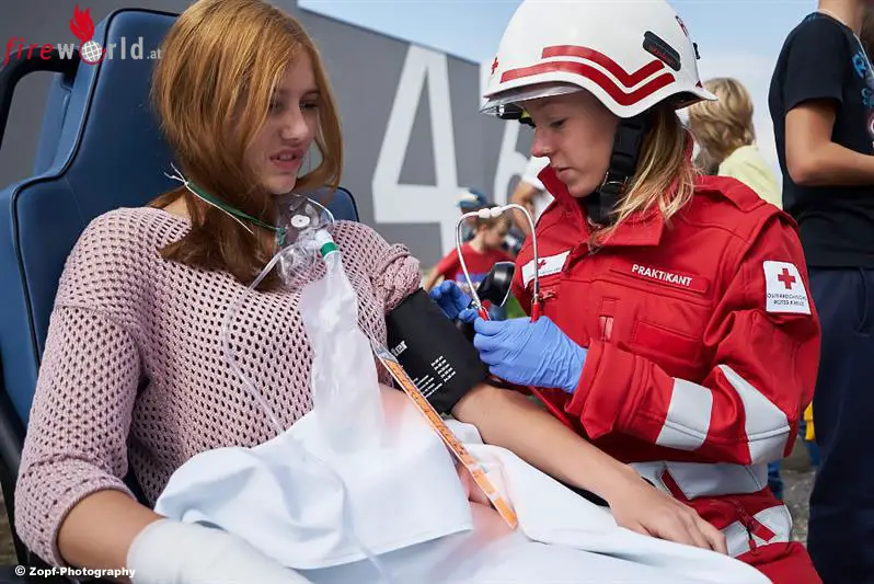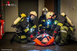 Während von drei Stellen – dem Schulzentrum, dem Lagerhaus und dem immerhin 1 Kilometer entfernten Baggersee – Löschwasser herbeigeschafft wurde, gingen weitere Einsatzkräfte unter Einsatz von schwerem Atemschutz unverzüglich an die Bergung der 130 in drei stark verrauchten Sälen versammelten Kinobesucher. 24 wirklichkeitsnah geschminkte „Verletzte“ unter ihnen wurden von den Florianijüngern geborgen und sofort vom Roten Kreuz versorgt und für den Weitertransport in die umliegenden Krankenhäuser vorbereitet. Entsprechend hoch war der Adrenalinspiegel bei allen Einsatzkräften.