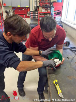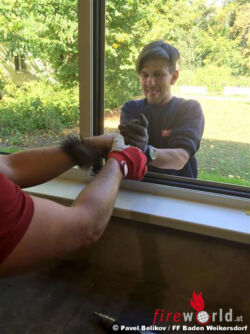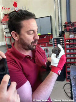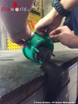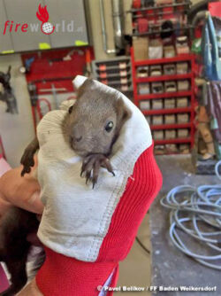 Ein Mitarbeiter des Stadtgartens Baden hat das gefangene Tier aus dem Doblhoffpark zur Feuerwehr Baden-Weikersdorf gebracht. Das Eichkätzchen wurde von Hauptbrandmeister Sinkovits und Oberfeuerwehrmann Rath von seiner Halskrause befreit und wollte sich unbedingt noch das neue Feuerwehrhaus näher ansehen. Nachdem es wieder eingefangen war, wurde es unverletzt in den Doblhoffpark entlassen.