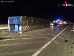 GLEISDORF (STMK): Der Lenker eines Lkw-Sattelzuges verlor gegen 02:30 Uhr des 23.09.2015 die Kontrolle über sein Fahrzeug, touchierte die Betonleitwand, kam ins Schleudern und stürzte um. Der Fahrzeuglenker wurde dabei unbestimmten Grades verletzt und von den Rettungskräften erstversorgt.