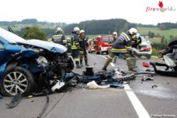 ZWETTL AN DER RODL (OÖ): Am Samstagmittag, 26. September 2015, stießen zwischen Zwettl an der Rodl und Oberneukirchen zwei Pkws frontal ineinander. Dabei wurden vier Personen, unter ihnen ein 16-jähriger Bursch, zum Teil schwer verletzt und mussten in umliegende Krankenhäuser eingeliefert werden.