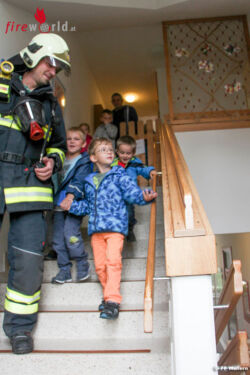 Um die Kinder auf diese Ereignis schon vorzubereiten, besuchten einige Tage zuvor Feuerwehrmitglieder die jeweiligen Gruppen und stellen die persönliche Schutzausrüstung eines Feuerwehrmannes in Ruhe vor.