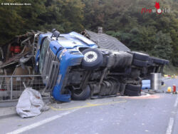 BORBECKE (DEUTSCHLAND): Auf der Bundesstraße 229 kippte am Morgen des 29. September 2015 ein Lkw auf ein Wohnhaus. Der Unfall ereignete sich gegen 08.40 Uhr in der Ortslage Borbecke (D).