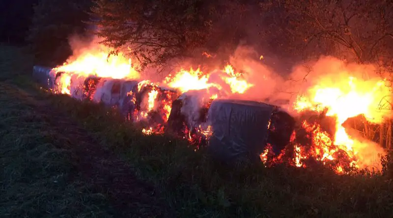 ENNEPETAL (DEUTSCHLAND): Am Montag, den 28.09.2015, um 19:00 Uhr wurde die Feuerwehr Ennepetal in die Lohernockenstraße gerufen. Auf einer Wiese brannten ca. 20 Heuballen in voller Ausdehnung.