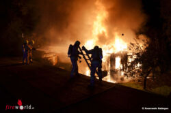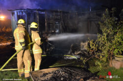 Die Feuerwehrangehörigen konnten nicht verhindern, dass das Gebäude bis auf die Grundmauern niederbrannte. Das Übergreifen der Flammen auf angrenzende Lauben konnte erfolgreich verhindert werden. Ein Trupp konnte eine Gasflasche aus den brennenden Gebäude holen und in Sicherheit bringen. Die Löscharbeiten zogen sich längere Zeit hin. Personen kamen glücklicherweise nicht zu Schaden. Zur Brandursache kann derzeit keine Aussagen getroffen werden, die Polizei ermittelt in der Sache.
