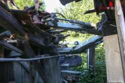 Ein Bauarbeiter stürzte mit seinem Minibagger über eine steile Böschung rund 40 Meter weit ab. Der Bagger überschlug sich mehrmals und blieb anschließend an einer Hütte hängen. Der Bauarbeiter wurde dabei schwer verletzt, vom Notarzt erstversorgt und anschließend mit dem Hubschrauber ins Krnakenhaus geflogen.