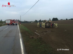 PROTTES (NÖ): Glück im Unglück hatte ein Pizzalieferant am 7. Oktober 2015 auf der L19 zwischen Prottes und Matzen. Der Fahrer kam aus unbekannter Ursache auf regennasser Fahrbahn von der Straße ab, kollidierte mit einem Masten, überschlug sich im angrenzenden Feld und kam auf dem Dach zum Stillstand.