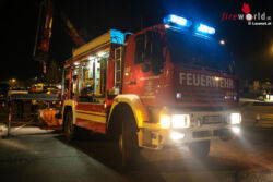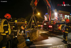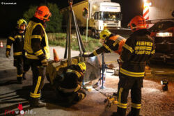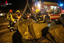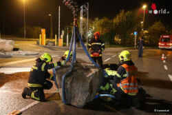 MARCHTRENK (OÖ): Die Feuerwehr Marchtrenk musste Dienstagabend, 6. Oktober 2015, mit dem Kran des Schweren Rüstfahrzeuges (SRF) einen großen Stein von der Unterharter Straße heben, nachdem ein Lkw diesen auf die Fahrbahn geschoben hatte.