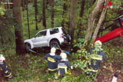 STEINBACH AM ZIEHBERG (OÖ): Am 7. Oktober 2015 wurde der Freiw. Feuerwehr Steinbach am Ziehberg zu einer Fahrzeugbergung alarmiert. Ein Pkw war in den Graben gefahren und im steilen Gelände zwischen zwei Bäumen hängen geblieben.