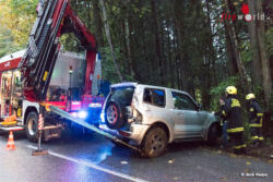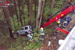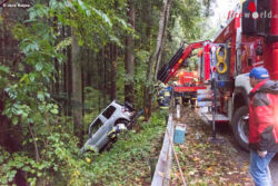 Oö: Autobergung mit Kran des Schweren Rüstfahrzeuges aus Waldstück in Steinbach am Ziehberg