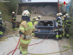 Währenddessen ging der nächste Übungsalarm für die Florianis der Hauptfeuerwache und der FF Pfandl ein. „Verkehrsunfall mit eingeklemmter Person – Schottergrube Falkensteiner“. Mit dieser Meldung machten sich zwei Trupps der FF Bad Ischl und der FF Pfandl auf den Weg in die Kiesgrube.