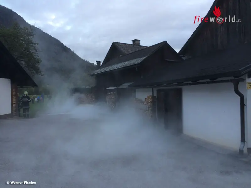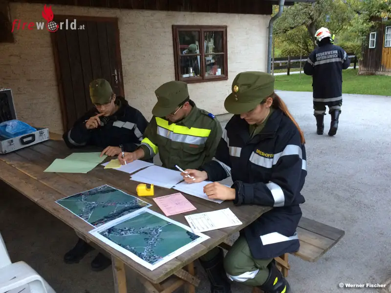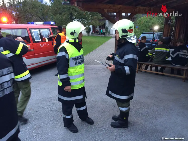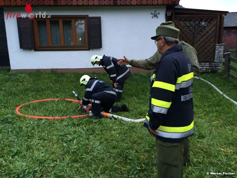 Anschließend erläuterte HBI Moser die geplante Einsatzübung für Bezirkskommandant-Stv. Brandrat Heinz Hartl, Bürgermeister Franz Frosch, Abschnittsbrandinspektor Werner Fischer sowie den 20 Delegierten, welche zugleich als Übungsbeobachter gekennzeichnet und eingeteilt wurden. Nach dem Sirenenalarm für die FF Unterkainisch und der Erkundung durch das Kommando beim Brandobjekt „Schmalzbauer“ und auf Grund der brisanten Situation sowie der geographischen Lage entschloss sich die Einsatzleitung Abschnittsalarm auszulösen. So heulten im gesamten Ausseerland die Sirenen und an die 140 (!) freiwillige Feuerwehrkameraden eilten koordiniert zum Brandobjekt. Zwar war vor Ort ein Hydrant vorhanden, doch der Wirtschaftgebäude- und Werkstättenbrand verlangte viel Wasser, da auch die eng angebauten Wohngebäude entsprechend zu schützen und kühlen waren. So mussten von der Traun (Glaserei Traidl) zwei Zubringleitungen und vom Ziegelbach eine Zubringleitung zum Unglücksort hergestellt werden.