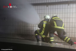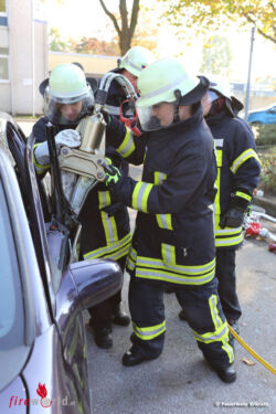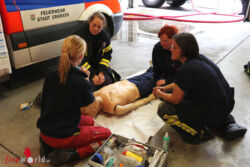 Aufgeteilt in vier Gruppen ging es sofort an die einzelnen Übungen. Die diensthabende Wachabteilung 1 der hauptamtlichen Wache führte u.a. ein Hohlstrahlrohrtraining sowie die Vorgehensweise bei einem Innenangriff durch und betreute die Höhensicherung an der Drehleiter, bei der die Teilnehmerinnen einen gesicherten Vorstieg von innen am Leiterpark wagen konnten. Des Weiteren gab es die Möglichkeit mit einem Wechelladerfahrzeug einen Abrollbehälter auf- und abzusatteln. Einen großen Raum nahm die technische Hilfe an einem verunfallten PKW ein. Hier wurden durch zwei Kameraden des Löschzuges Millrath die unterschiedlichsten Techniken zur Befreiung von eingeklemmten Fahrzeuginsassen demonstriert und trainiert. Betreut durch den Rettungsdienst der Feuerwehr Erkrath konnten die Teilnehmerinnen auch ihre Kenntnisse bei einer Reanimation auffrischen.