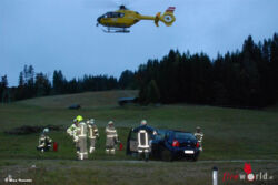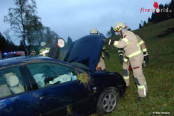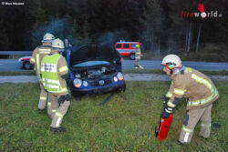 Parallel dazu erging die Alarmierung auch an die Feuerwehren Unterleutasch sowie Seefeld. Beim Eintreffen des Rüstlöschfahrzeuges waren die Kräfte von Rettungsdienst und Exekutive bereits vor Ort und kümmerten sich um die junge Fahrzeuglenkerin. Eine vom Einsatzleiter durchgeführte Lageerkundung ergab einen auf der Seite liegenden Pkw, in dem sich keine Personen mehr befanden jedoch Rauch austrat. Umgehend wurde ein Brandschutz errichtet, das Fahrzeug auf die Räder gestellt und die Batterie abgeklemmt.