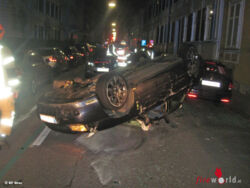 Ein Pkw hatte zwei geparkte Autos touchiert, bevor dieser auf dem Dach zu liegen kam. Lenker und Beifahrer konnten sich selbst aus dem Auto befreien und wurden vom Roten Kreuz versorgt. Nach dem Reinigen der Fahrbahn und Abtransport des Fahrzeuges konnte die Berufsfeuerwehr den Einsatz beenden. Die Berufsfeuerwehr stand mit vier Fahrzeugen und 16 Mann im Einsatz.