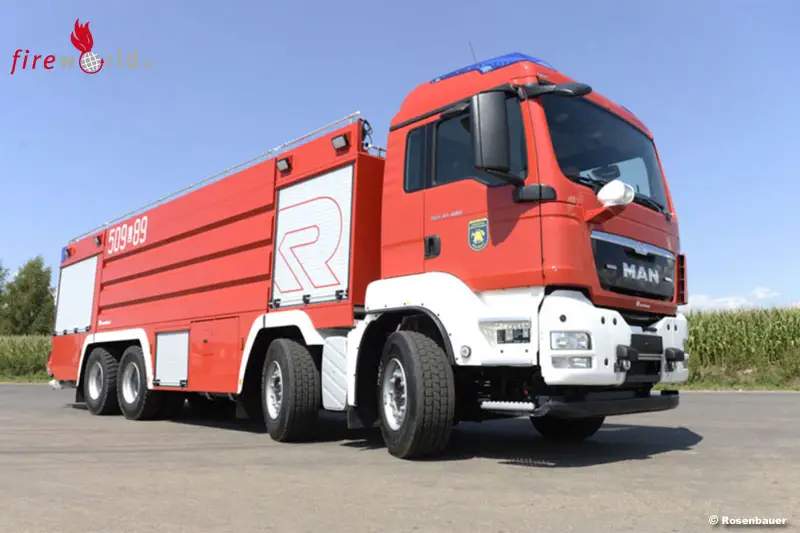 Für perfekte Sicht auch bei nächtlichen Einsätzen sorgt die LED-Beleuchtung, die das Umfeld ebenso wie den Geräteraum erhellt. Ein pneumatischer Lichtmast und der elektrisch gesteuerte Suchscheinwerfer an der Fahrerkabine können bei Bedarf ebenfalls noch aktiviert werden. Die LCS 2.0 Displaysteuerung punktet mit einfacher und intuitiver Bedienung. Aufgebaut ist das Schaumlöschfahrzeug auf einem MAN Fahrgestell mit vier Achsen. Für den Antrieb sorgt ein EURO5-Motor mit 480 PS.