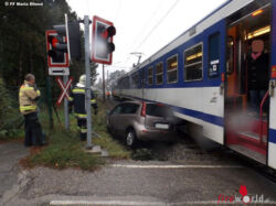 MARIA ELLEND (NÖ): Am 15.10.2015 um 11.52 Uhr wurden die Feuerwehren von Haslau/D. und Maria Ellend zu einer Fahrzeugbergung nach einem Verkehrsunfall zwischen einer Schnellbahngarnitur der Linie S 7 und einem Pkw nach Maria Ellend, Eisenbahnkreuzung mit der Nußallee, beordert.