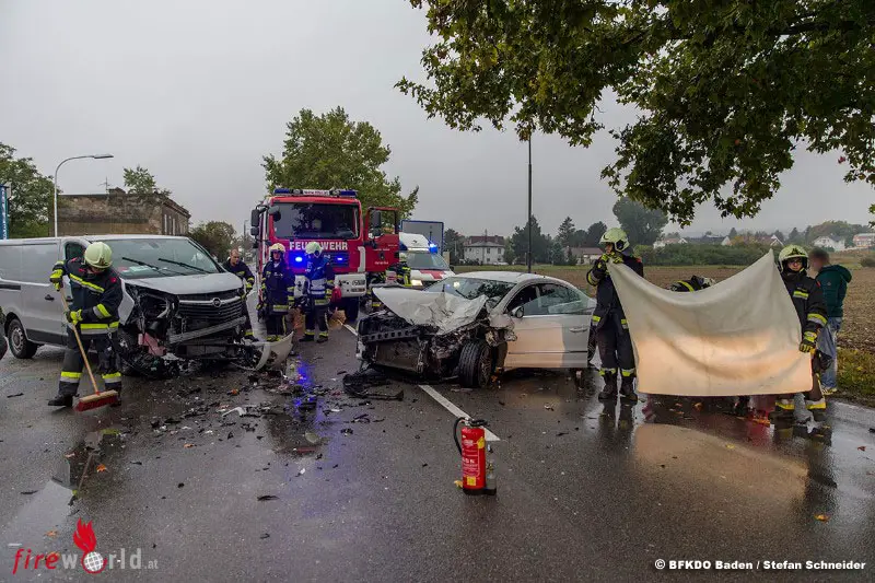 Die anfängliche Meldung über ein noch im Unfallwrack eingeklemmtes Kind bestätigte sich beim Eintreffen der alarmierten Einsatzkräfte glücklicherweise nicht. Die Feuerwehreinsatzkräfte unterstützten das ebenfalls alarmierte Notarztteam bzw. die Rettungskräfte bei der Versorgung des verletzten Kindes. Dieses wurde mit Verletzungen unbestimmten Grades mit einen Rettungsfahrzeug vom Roten Kreuz Bad Vöslau ins Spital eingeliefert. Die anderen Fahrzeuginsassen wurden auch von den Rettungskräften ebenso betreut, mussten aber nicht in ein Spital eingeliefert werden.
