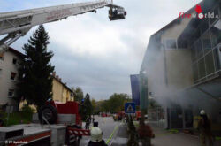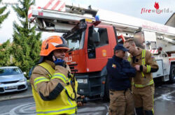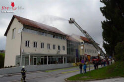 Ein weiterer Höhepunkt der gemeinsamen Übung war der Einsatz der Teleskopmastbühne der Feuerwehr Marburg. Der Atemschutztrupp Šentilj und Spielfeld evakuierten gemeinsam mit der Feuerwehr Marburg zwei der vermissten Personen über die TMB aus einer Luftigen Höhe knapp über 15 Metern.
