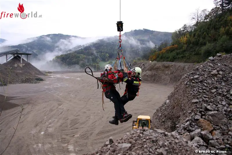 In einer Schottergrube konnte gemeinsam mit der Bergrettung Lilienfeld geübt werden. Nachdem die Übungsstellen als Ablöseszenario geplant waren, übten zwei KHD Züge in zeitlichem Abstand dieselben Lagen. Neben einem abgestürzten Pkw galt es, zwei Verschüttete zu retten oder einen verletzten Arbeiter mittels Kranseilwinde aus der Schottergrube zu retten.