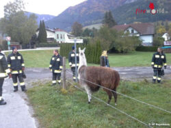 Währenddessen die Payerbacher die Einsatzbereitschaft herstellten, bekam die Wehr die Meldung über zwei entflohene Lamas. Ein Lama konnte kurz darauf in der Fritz Hofer Straße gefunden werden, welches anschließend von der Besitzerin ins Gehege zurück gebracht wurde. Nach weiterer Information wurde das zweite Lama in Reichenau gesichtet. Gemeinsam mit der Feuerwehr Reichenau wurde das Ortsgebiet abgesucht. Nach ca. zwei Stunden konnten das zweite Lama im Rothschildpark gefunden werden. Dort wurde es dann gemeinsam mit der Besitzerin eingefangen und wieder zurück ins Gehege zum zweiten Lama gebracht.