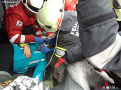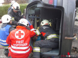 Bei der zweiten Station waren zwei Pkw und ein Moped in einen Unfall verwickelt worden. Hier mussten die Einsatzkräfte zunächst den unter einem Fahrzeug eingeklemmten Mopedlenker befreien. Danach wurden mit Hilfe des hydraulischen Rettungssatzes des Kleinrüst-Fahrzeuges die drei eingeklemmten Insassen der PKWs befreit. Ein besonderer Augenmerk lag hier bei der lückenlosen Kommunikation der Einsatzkräfte aller beteiligten Organisationen. Beide Gruppen konnten auch dieses einsatznahe Übungsszenario in kürzester Zeit erfolgreich abarbeiten. Übungsbeobachter Bernhard Buchecker konnte in den Nachbesprechungen jeweils von lückenloser Zusammenarbeit aller Beteiligten berichten.