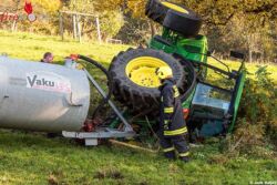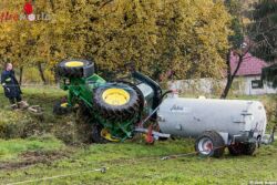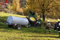 MICHELDORF (OÖ): Am 28. Oktober 2015 wurde die Feuerwehr Micheldorf über die Landeswarnzentrale Oberösterreich zu einem Traktorabsturz alarmiert. Ein Traktor mit ein Güllefass ist auf einer Wiese ins Rutschen gekommen und am Ende der Wiese umgestürzt.