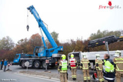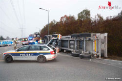 Laut Angaben der Polizei sackte der Anhänger aufgrund eines technischen Gebrechens ab. Sowohl der Anhänger als auch das Zugfahrzeug kippten daraufhin auf die rechte Seite. Der 25-jährige Fahrer des Lkw blieb unverletzt. Um das Fahrzeug wieder aufzurichten, musste ein Kran angefordert werden. Die Hochspannungsleitung der VKW, die über der Unfallstelle verläuft, wurde in dieser Zeit abgeschaltet. Zu Problemen bei der Stromversorgungen kam es dadurch nicht.
