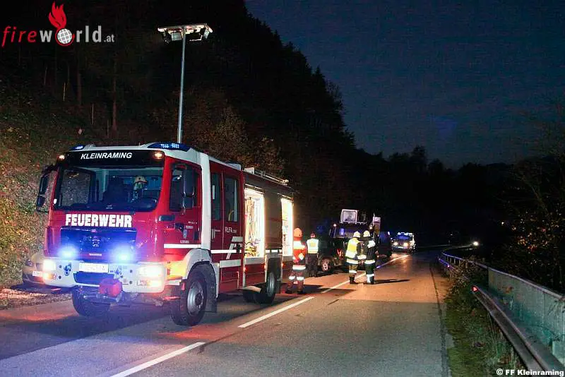 KLEINRAMING (OÖ): Am Morgen des 31. Oktober 2015 heulten kurz vor 6 Uhr die Sirenen in Kleinraming und St. Ulrich. Die Landeswarnzentrale alarmierte die beiden Feuerwehren zu einem Verkehrsunfall auf der Ramingtalstraße. Am Grillberg kollidierten ein Pkw und ein Lkw.