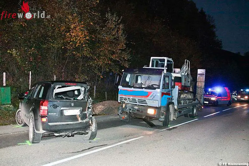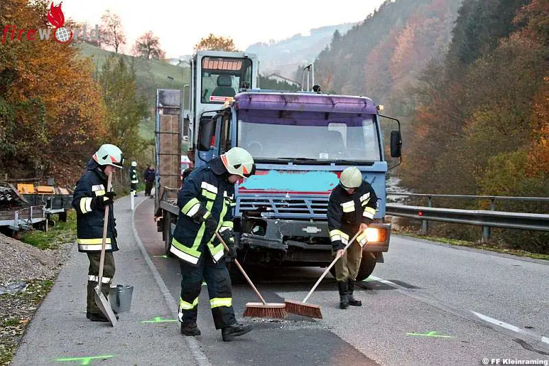 KLEINRAMING (OÖ): Am Morgen des 31. Oktober 2015 heulten kurz vor 6 Uhr die Sirenen in Kleinraming und St. Ulrich. Die Landeswarnzentrale alarmierte die beiden Feuerwehren zu einem Verkehrsunfall auf der Ramingtalstraße. Am Grillberg kollidierten ein Pkw und ein Lkw.