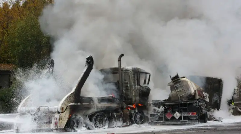 Deutschland: Zwei Lastwägen – darunter ein Heizöl-Tankwagen – brennen nach Zusammenstoß