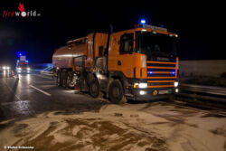 Nach Eintreffen der alarmierten Feuerwehreinsatzkräfte aus Klausen Leopoldsdorf und Heilgenkreuz wurde das 50t Stützpunktkranfahrzeug der FF Mödling nachgefordert. Einsatzkräfte der Autobahnpolizei Alland, sowie weitere angeforderte Polizeistreifen aus dem Bezirk und Mitarbeiter der ASFiNAG sicherten die Unfallstelle großräumig ab und richteten in Folge eine Totalsperre des betroffenen Autobahnabschnittes in Fahrtrichtung Wien ein. Betriebsmittel des verunfallten Tanklastzuges flossen über die komplette Fahrbahn und mussten von den Einsatzkräften umgehend gebunden werden. Eine Herausforderung stellt jedoch die Ladung des umgestürzten Tanksattelzuges dar. Die Ladung ca. 25to Palmöl (Pflanzenöl) müssen zuerst umgepumpt werden, bevor der Schwerlastzug geborgen werden kann. Palmöl ist in vielen Produkten unseres täglichen Lebens enthalten. Wie zum Beispiel in Nahrungs- und Genussmitteln, in Fertigprodukten, in Kosmetikprodukten, Waschmitteln oder Kerzen. Das Medium hat jedoch einen Schmelzpunkt von 30-37°C und wird, um flüssig zu bleiben, in einem beheizten isolierten Silo Tank transportiert. Leider konnte in den Nachtstunden keine notwendige Spezialtransportfirma an die Einsatzstelle herangebracht werden.