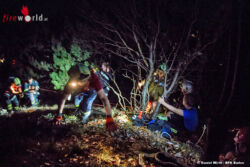 Die Steilheit des Geländes erschwerte das Vorrankommen der Einsatzkräfte, welche sich mit reichlich Sicherungs- und Seilmaterial auf den Weg gemacht hatten. Gleichzeitig versuchten weitere Feuerwehrkräfte von einem Plateau unterhalb des ca. 40 Meter hohen Steilhanges die Familie ausfindig zu machen, was nach kurzer Suche auch gelang. Dadurch konnten die aufsteigenden Einsatzkräfte zu den Personen gelotst werden. An dem Abhang angekommen wurden mehrere Seile aufgebaut und insgesamt drei Retter stiegen gesichert zu den verängstigten Kindern und ihrem Vater ab. Behutsam wurde das tapfere 4-jährige Mädchen in eine Korbschleiftrage gelegt und die Böschung hinauf gezogen. Danach konnte auch der Vater und die 2 jährige durch diesen Vorgang unverletzt gerettet werden.