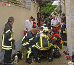 Da auch eine Zufahrt einer Drehleiter zum Hinterhof nicht möglich war, entschied sich der Einsatzleiter zu einer Personenrettung über tragbare Leitern. Dazu wurde ein so genannter Leiterbaum aufgebaut um den Patienten schonend in einer Schleifkorbtrage nach unten zu transportieren. Unter ständiger notärztlicher Überwachung konnte der Patient schließlich dem Rettungsdienst der Feuerwehr übergeben werden um ihn dann in ein Krankenhaus zu transportieren. Der Einsatz dauerte zirka eine Stunde und 30 Minuten.