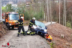 BAD ISCHL (OÖ): Um 10:26 Uhr wurden die Feuerwache Ahorn-Kaltenbach sowie des 2. Bereitschaftszuges der FF Bad Ischl am 10. November 2015 zu einer Fahrzeugbergung auf der Katereckstraße alarmiert. Ein Fahrzeuglenker war von der Fahrbahn abgekommen und saß dabei mit seinem Auto auf der Bodenplatte des Fahrzeuges auf.