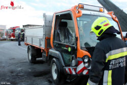 TULLN (NÖ): Am 09.11.2015 wurde die Feuerwehr Tulln um 15:36 Uhr zu einer neuerlichen Fahrzeugbergung im Drakenkreisverkehr alarmiert. Zwei Mitarbeiter der Stadtgemeinde Tulln waren mit einem Lindner Unitrac 102, welcher mit Asphaltbruch beladen war, auf der Südumfahrung unterwegs.