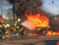 DIESSENHOFEN (SCHWEIZ): Durch eine elektrostatische Entladung entzündete sich am Dienstag, 10. November 2015, in Diessenhofen Benzin bei einem Tankvorgang. Die Fahrzeugkombination geriet in Vollbrand.