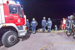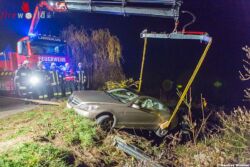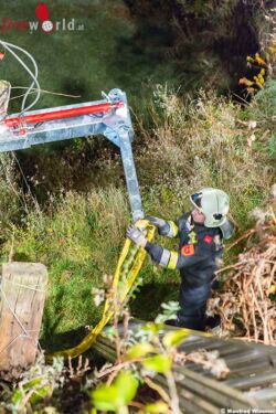 Nachdem die Person mit Hilfe der Feuerwehr das Fahrzeug verlassen konnte, wurde sie an den bereits anwesenden Rettungsdienst übergeben. Die Bergung des Fahrzeuges erfolgte im Zusammenspiel der Seilwinde mit dem Ladekran vom Wechselladefahrzeug der FF Langenlois. Mittels Ladekran wurde der Mercedes im Heckbereich aufgehoben und mit der Seilwinde vorsichtig auf den Parkplatz gezogen.