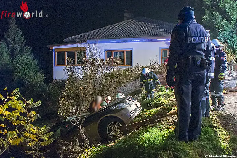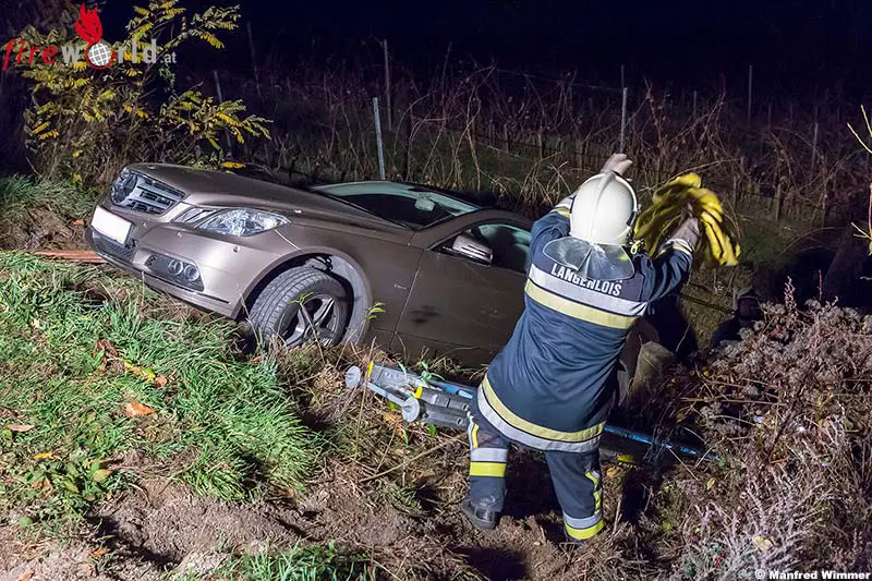 MOLLANDS (NÖ): Zu einem technischen Einsatz mit Menschenrettung wurden am 13. November 2015, um 1.24 Uhr die Feuerwehren Mollands, Langenlois und Schönberg am Kamp alarmiert. Ein Pkw rutschte aus unbekannter Ursache auf einen Parkplatz über eine Geländekante rückwärts in einen Weingarten und blieb auf einer Stützmauer hängen.