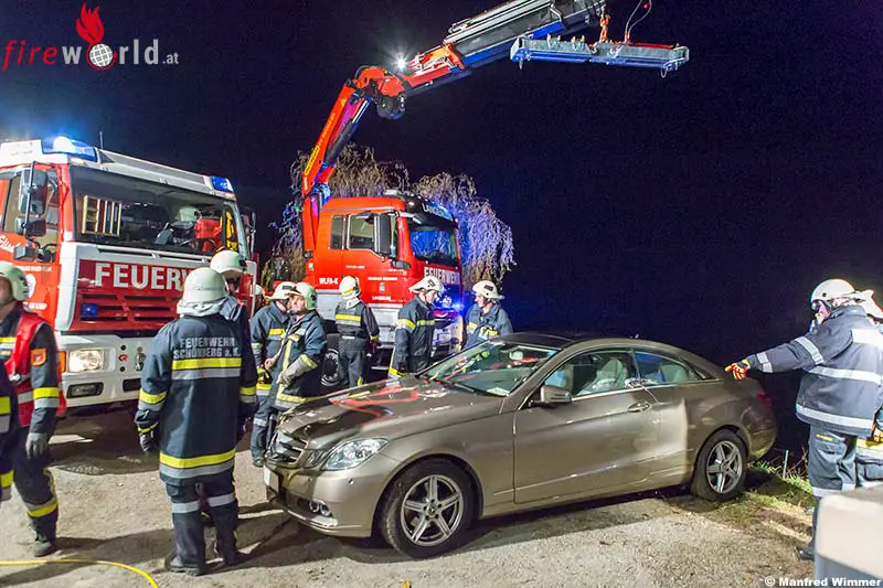 Nachdem die Person mit Hilfe der Feuerwehr das Fahrzeug verlassen konnte, wurde sie an den bereits anwesenden Rettungsdienst übergeben. Die Bergung des Fahrzeuges erfolgte im Zusammenspiel der Seilwinde mit dem Ladekran vom Wechselladefahrzeug der FF Langenlois. Mittels Ladekran wurde der Mercedes im Heckbereich aufgehoben und mit der Seilwinde vorsichtig auf den Parkplatz gezogen.