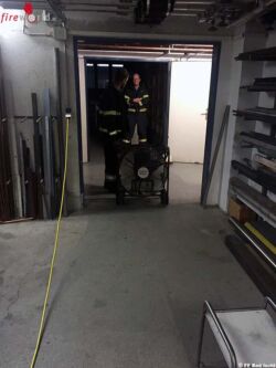 Die Kameraden der Hauptfeuerwache machten die betroffenen Räume durch die Belüftung mit mehreren Hochleistungslüftern wieder „dampffrei" und konnten somit wieder in die Zeugstätte einrücken.